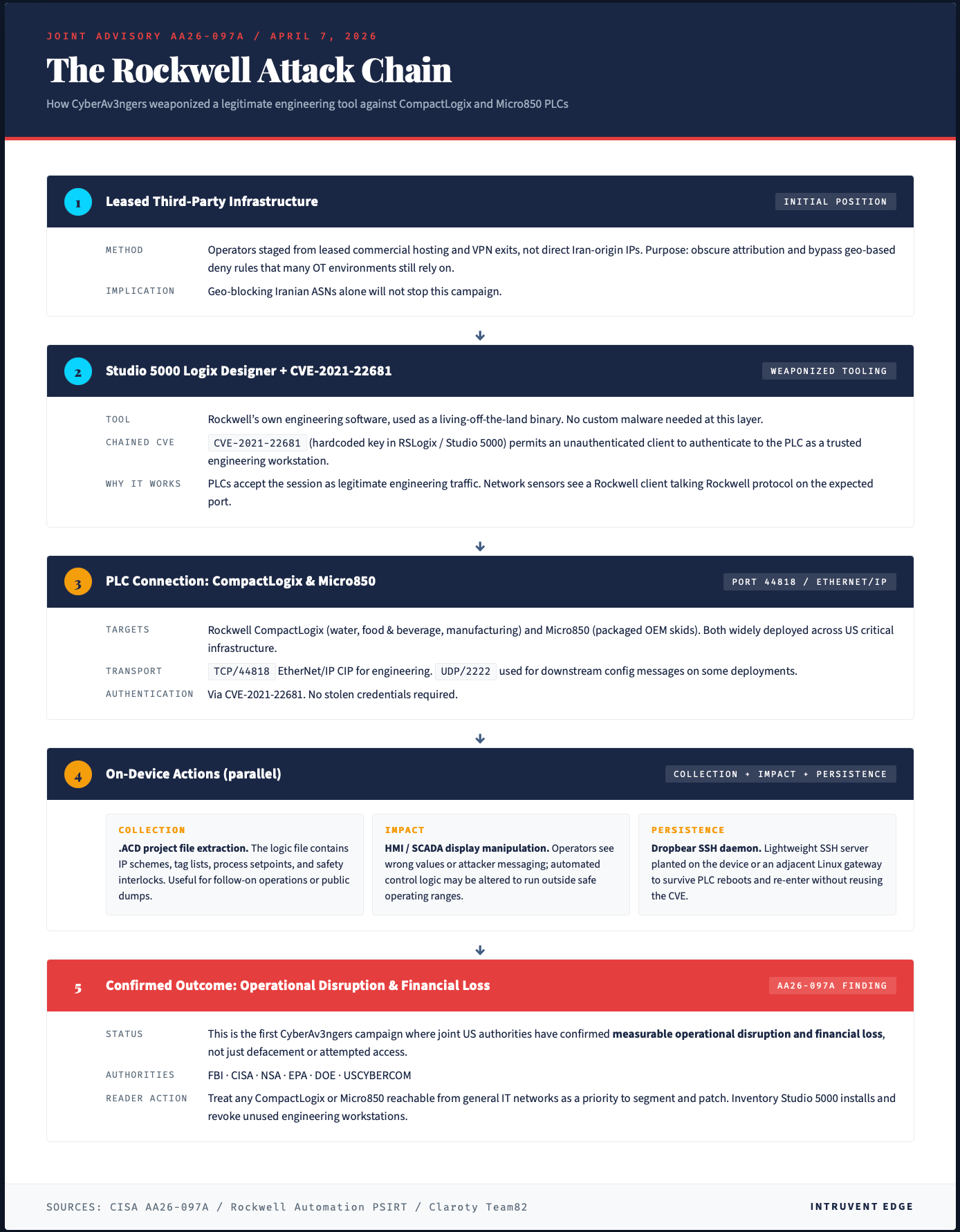According to AA26-097A, the operators are now using “leased, third-party hosted infrastructure with configuration software, such as Rockwell Automation’s Studio 5000 Logix Designer software, to create an accepted connection to the victim’s PLC.” They are not exploiting a software vulnerability in the traditional sense. They are using the exact tools that legitimate engineers use to program and maintain these controllers, which means the resulting network traffic looks like engineering activity to most detection tooling.