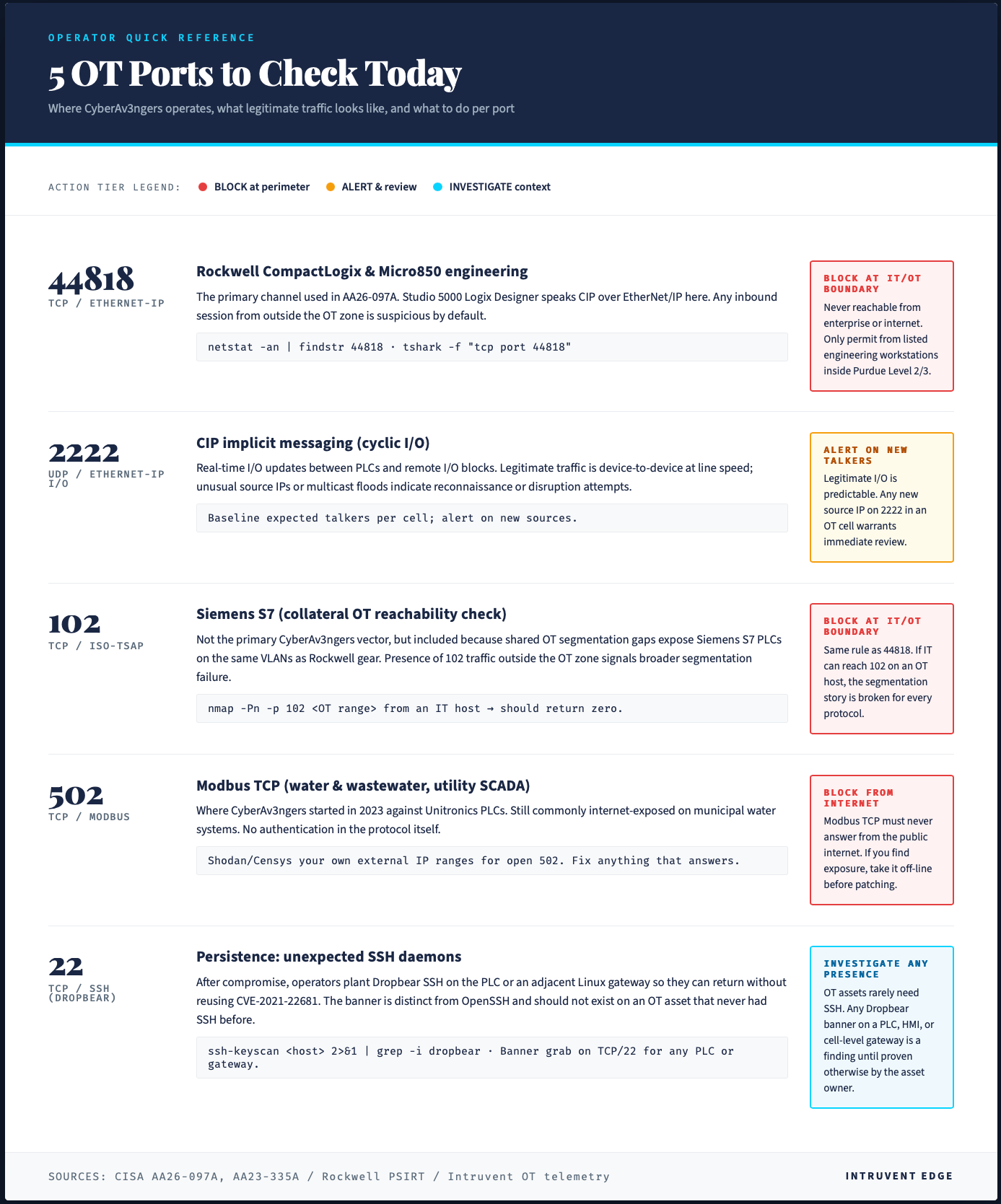 Check the ports. Scan your external perimeter for services on TCP 44818 (EtherNet/IP), 2222, 102 (ISO-TSAP), 502 (Modbus), and 22 (SSH). Any inbound access to these ports from untrusted networks should be blocked.