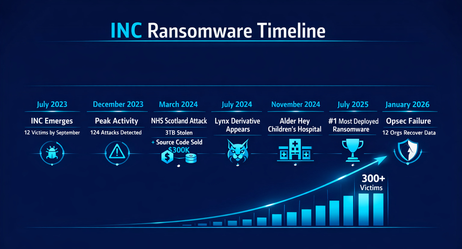 The numbers tell the story: 162 victims in 2024. Over 300 in 2025. In July 2025, INC became the most deployed ransomware by victim count. They average 11 organizations per month.