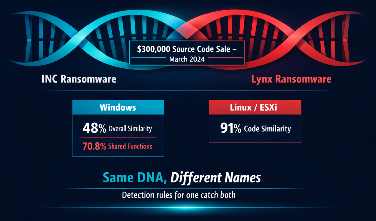 By July 2024, a new operation called Lynx emerged. Binary analysis showed 48% overall code similarity with INC. The Linux variants showed 91% overlap.