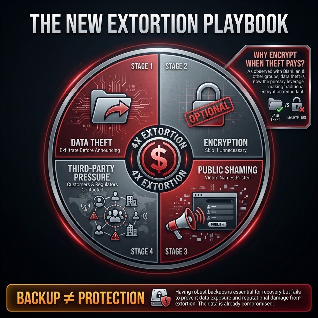 January data confirms a shift in ransomware economics: encryption is increasingly optional. The modern extortion playbook: