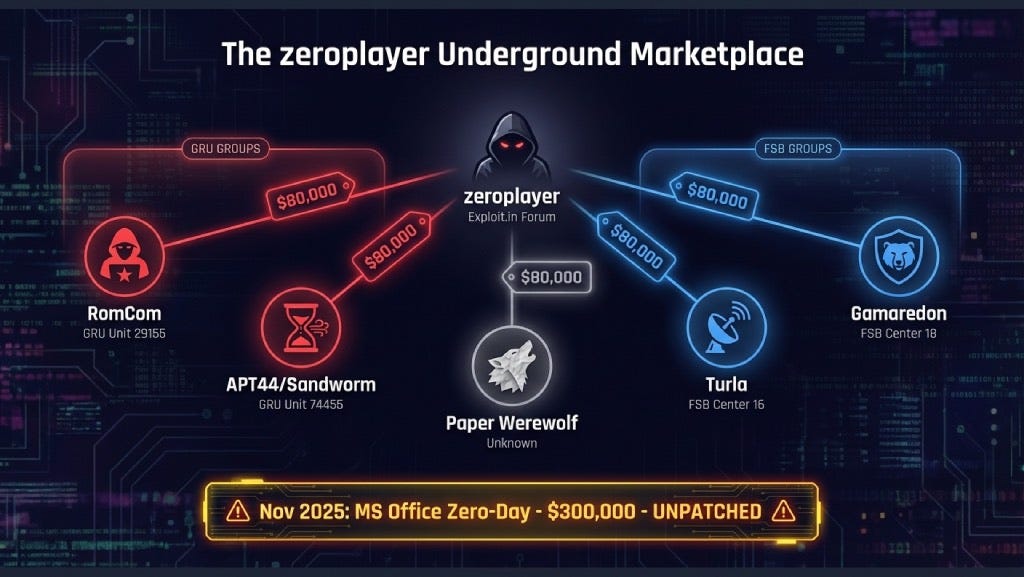 Multiple Russian APTs are buying from the same underground marketplace. This suggests either coordination or simply that good exploits attract all buyers. Either way, when a new zero-day hits the market, expect rapid multi-actor adoption.
