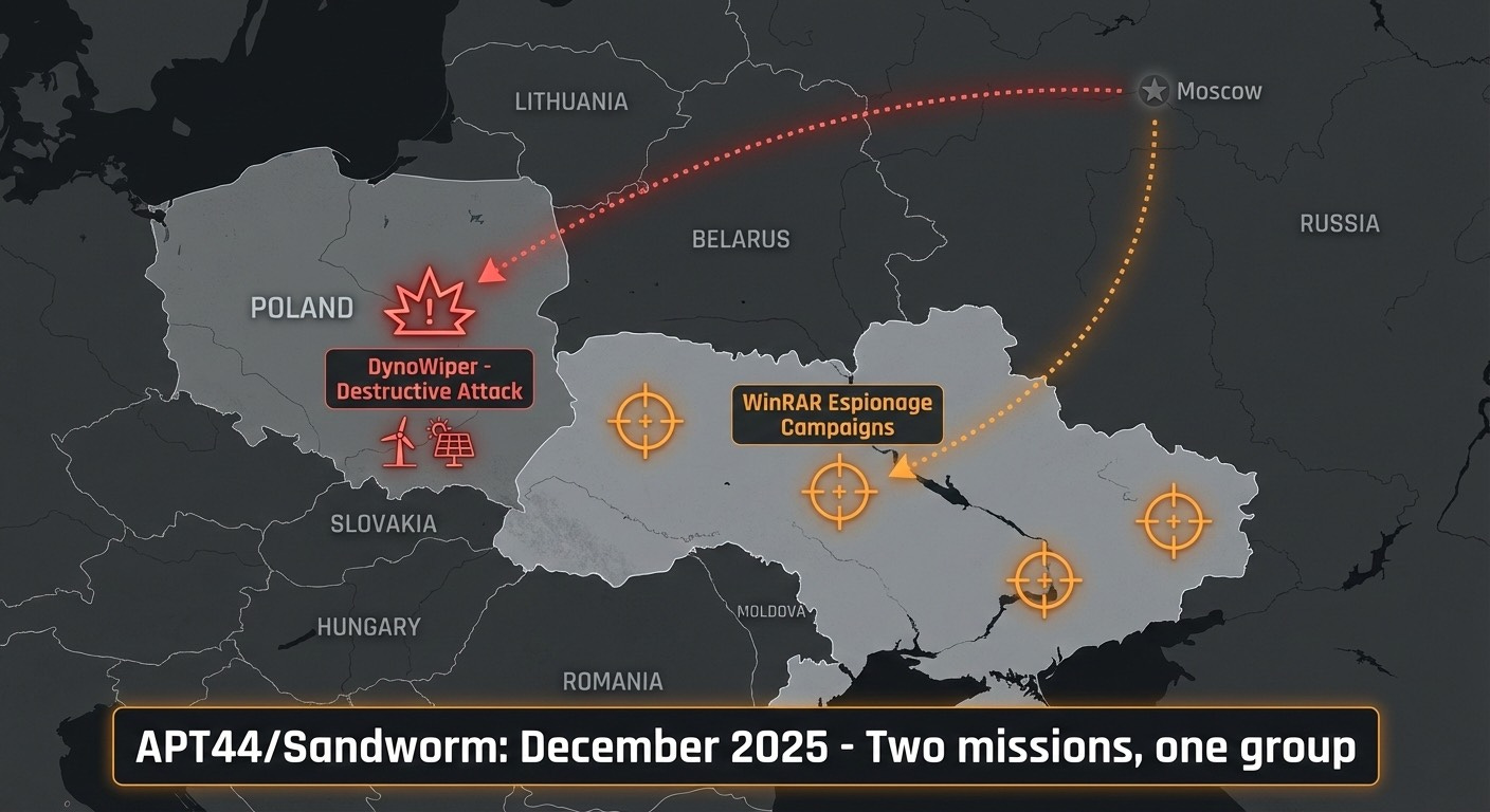 Sandworm wasn’t just deploying DynoWiper against Poland. They were simultaneously running WinRAR-based espionage campaigns against Ukrainian targets. Destructive and espionage operations, same time, same group.