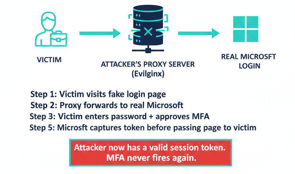 The page you logged into was running through a reverse proxy: a server sitting invisibly between you and the real Microsoft login. When you completed your MFA challenge, the proxy captured the session token that Microsoft issued after your successful authentication. The attacker takes that token, loads it into their own browser, and they’re in. Microsoft thinks they’re you. MFA never fires again because the token says authentication already happened.