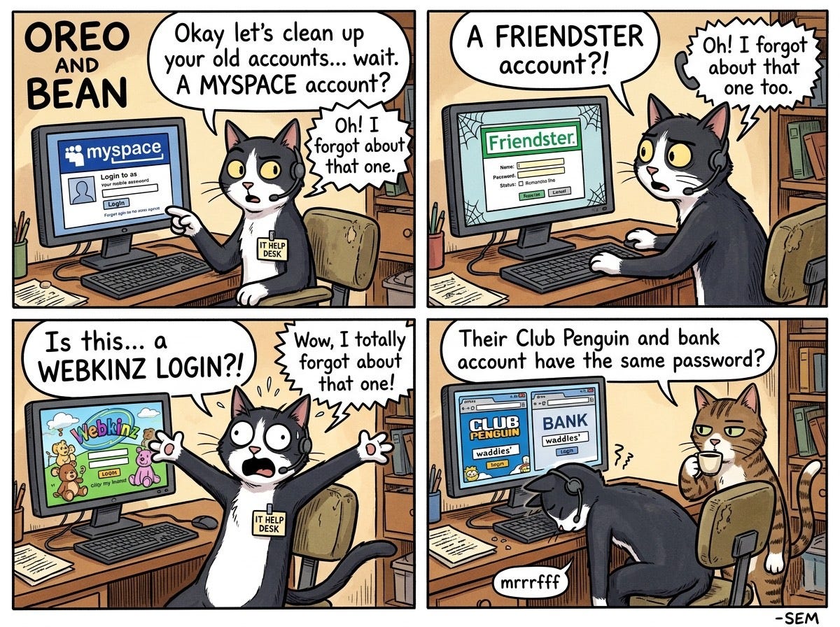 According to a Beyond Identity survey, 10% of people are still using a password they first created as a teenager. That means somewhere out there, a bank account, an email inbox, or a corporate VPN is protected by the same password someone picked for their Neopets account in 2007. Which brings us to this week’s Oreo and Bean comic: