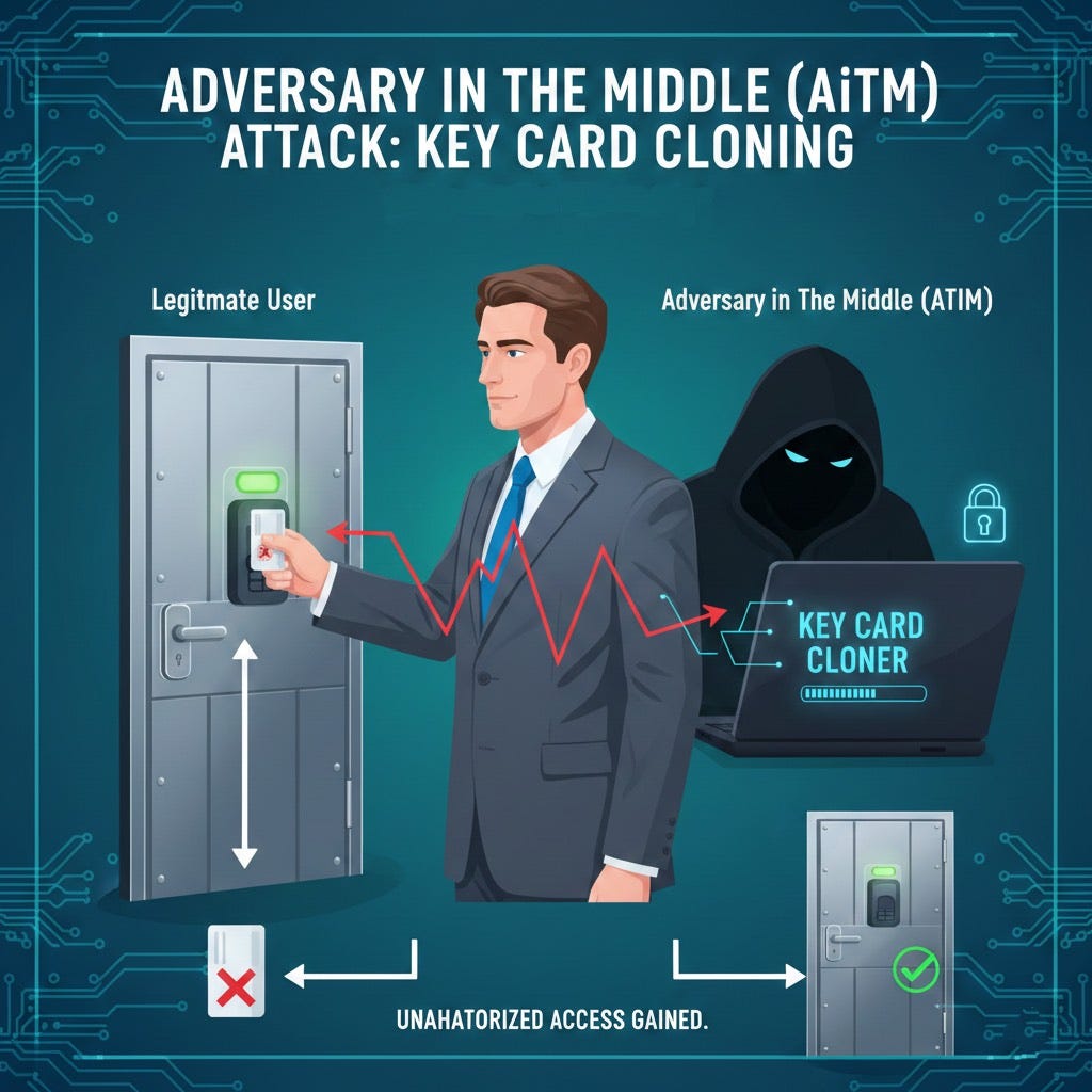 Think of it via this analogy: Classic MitM steals your key. AiTM waits for you to unlock the door, then clones the “already verified” badge before you step inside.