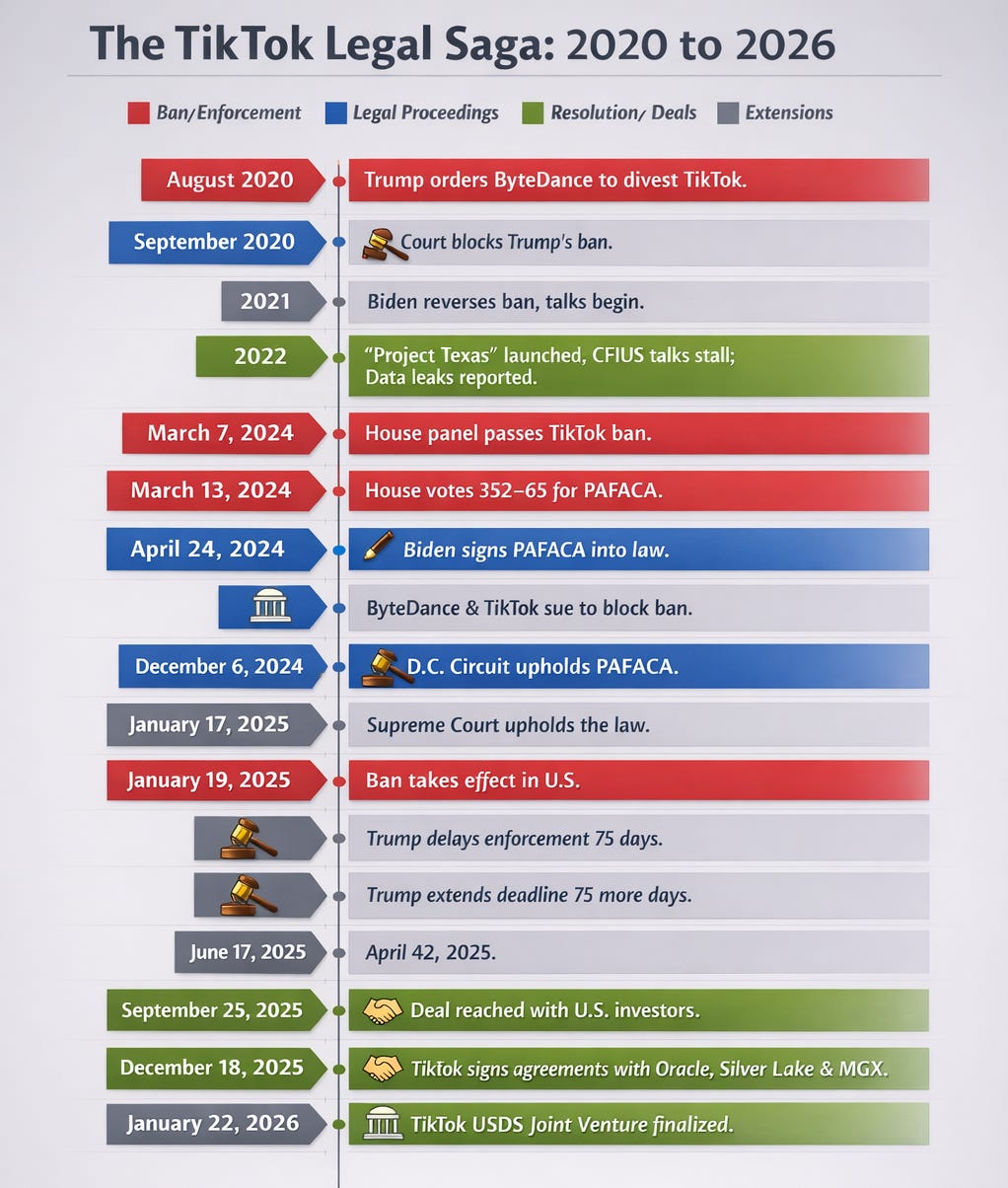 Congress finally took decisive action in April 2024, passing the Protecting Americans from Foreign Adversary Controlled Applications Act (PAFACA), which gave ByteDance nine months to sell or face a nationwide ban. After the Supreme Court unanimously upheld the law in January 2025 and the app briefly went dark for U.S. users, President Trump (now in his second term) stepped in with multiple deadline extensions while brokering a deal. The resolution came in January 2026 when TikTok's U.S. operations were transferred to a new joint venture controlled by American investors including Oracle, Silver Lake, and Abu Dhabi's MGX, with ByteDance reduced to a minority stake below the 20% threshold required by law.
