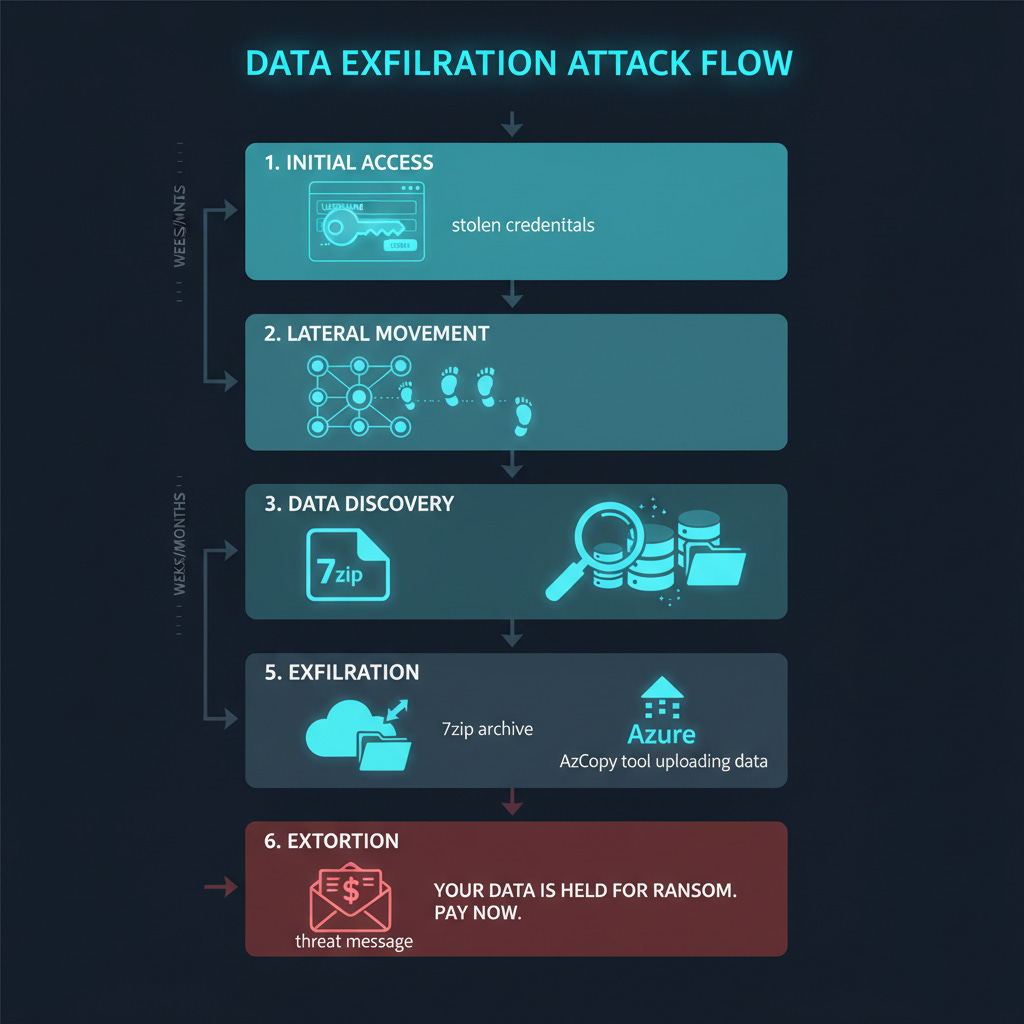 Exfiltration-only attacks are quiet. The attacker gains access (often through stolen credentials or a vulnerable internet-facing system), moves laterally to find valuable data, and copies it out of the network. No files are modified. No services go offline. No alarms ring. The first indication that anything happened may be a ransom note in your inbox, weeks after the theft occurred.