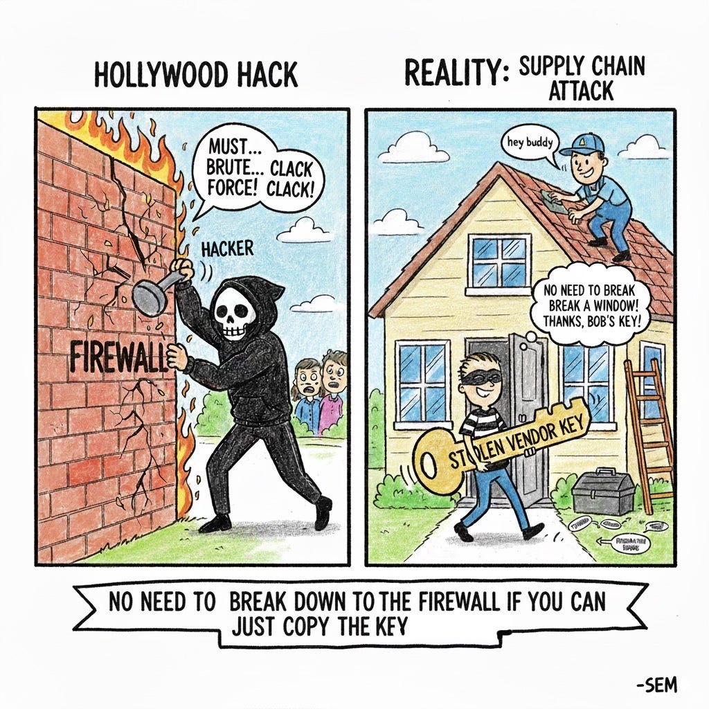 Supply chain attacks are increasing almost exponentially. Why? Here’s how you can think about it: cybercriminals are no longer trying to break in at the front door. They’re going after the plumbers, electricians, and contractors who already have access. It’s the reality of modern business, where every digital service is both a convenience and a potential risk. Our as job as security professionals isn’t to eliminate those risks entirely… that’s impossible. But we can manage them, limit the blast radius when things go wrong, and hold vendors accountable for protecting the trust we extend to them.